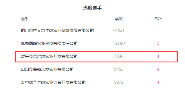 核心提示:熱烈慶祝富平縣果爾惠農(nóng)業(yè)開發(fā)有限公司在百姓放心陜西優(yōu)秀農(nóng)業(yè)企業(yè)(第四期)的網(wǎng)絡(luò)評選中以7036票榮獲第三名。獲得《AAA級放心